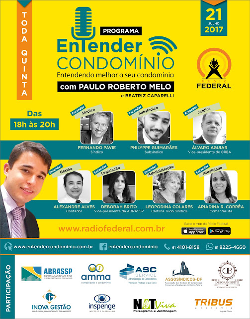 O programa ENTENDER CONDOMÍNIO na Rádio Federal toda quinta-feira, das 18:00 às 20:00, é apresentado pelo Jornalista Paulo Roberto Melo com o apoio de Beatriz Caparelli, o programa tem o slogan – entendendo melhor o seu condomínio